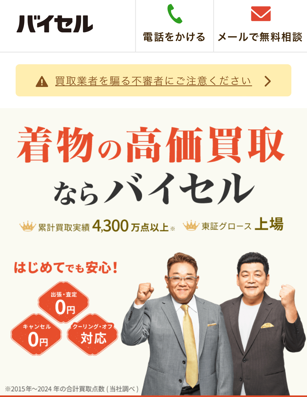 バイセルは、自宅で完結する「出張買取」に特化した便利なサービスです。査定料・出張料などすべて無料のため、気軽に価格を知りたい人にも向いています。着物、ブランド品、時計、ジュエリーなど幅広く見てくれるので、家の整理や断捨離にもぴったりです。